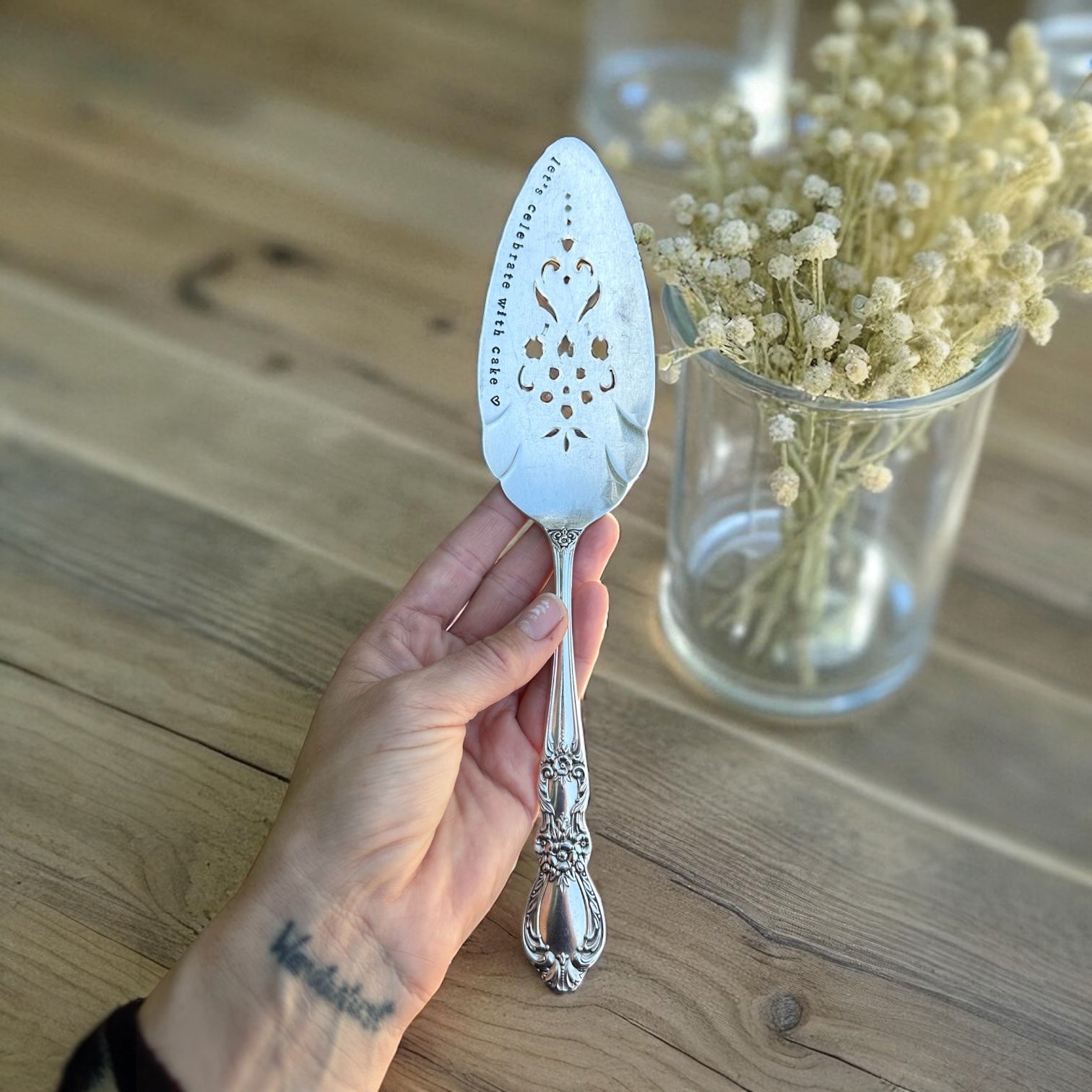 Each piece of cutlery in my shop is hand-stamped, making every item truly unique. As they are crafted from vintage pieces, no two are ever the same. The cake server you receive will be selected from my current stock, ensuring a one-of-a-kind addition to your collection. Once your order is placed, I will email you a selection of the available cake slices suitable for your order, so you can choose the perfect piece.